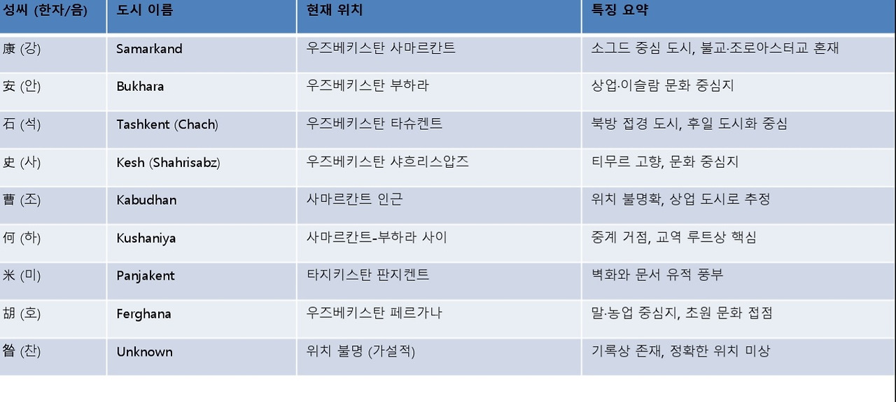 | 소그드 9성 | 파르티아-소그디아 계통 유민 집단의 후신 |